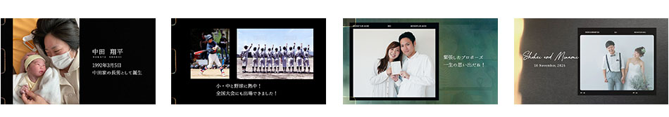 映写機のフィルムロールオープニングが印象的なムービーです。あえて黒バックに写真を配置し、シンプルかつ見やすいデザインに仕上げました。※サンプルは著作権フリー曲を使用して制作しています。