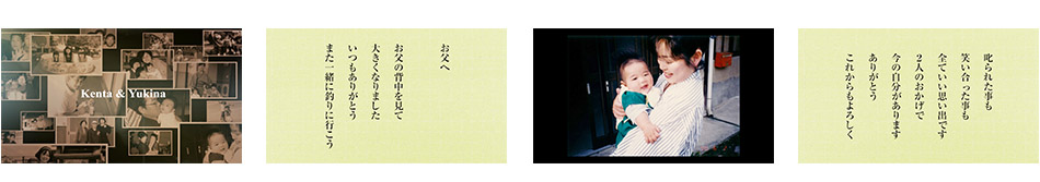 今まで育て、支えてくれた両親や家族へ感謝の気持ちを伝えるムービーですチャペルでバージンロードを歩く前や、披露宴でお手紙を読まれる前など感動的なシーンに。